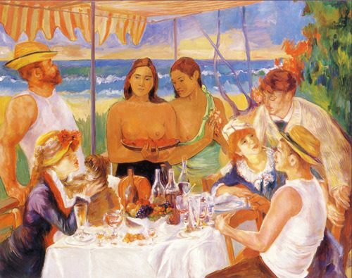 This is my anti-colonialist painting. Renoir painted the affluent young bohemians and bourgeoisie of his time as they wished to see themselves in his famous Luncheon of the Boating Party. His friend and benefactor, the painter Caillebotte, smoking, leans on the back of a chair at the right. Renoir's future wife sits at the left, playing with a little dog. Charming as it seems, it was the sort of society that Gauguin tried to put behind him when he left France, looking to find in Tahiti a purer, more innocently savage state of nature. He arrived late. The French colonial authorities and missionaries had already been happily about their work of repressing, converting, and covering up bodies, a process Gauguin did his best to reverse. By joining the two worlds, my painting represents the familiar phenomenon of older, or less "civilized," cultures seeking to survive by displaying their picturesqueness to the tourists. Now, of course, it's the Tahitians who would look most at home on the beach at St. Tropez.