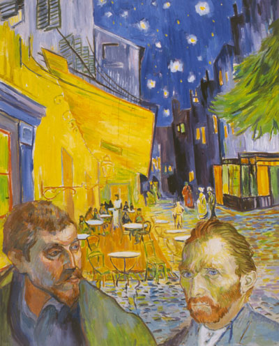 For all the drama of Paul Gauguin's two-month stay in Arles with Vincent Van Gogh, we know of no image of him there, neither painting nor fading photograph. To correct this historical oversight, I used a self-portrait that Gauguin had made as part of an exchange with Van Gogh and placed him in front of the terrace cafe that was the subject of a famous work by Vincent. When I looked at the painting years later, I realized what was so obviously missing, and immediatly looked for the late self-portrait that summed up Vincent for me. Then I changed Gauguin's gaze so that he addresses the question directly to his friend.