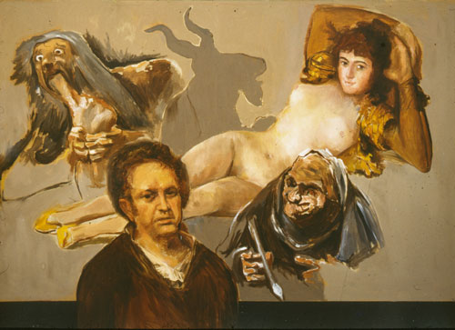 Fantastic visions and nightmares came readily to Goya's mind after he witnessed the horrors of the war between France and Spain. My fantastic vision saw Goya presenting slides of his work to the Madrid Art Association. The nightmare, familiar to artists who have shown slides of their precious creations in similar circumstances, is that the slides are disorganized, out of order, upside down, or, in this extreme case, bunched up in the same slot in the projector. The result is like a collage, featuring most prominently a combination of his two notorious paintings of the Duchess of Alba, one nude and the other clothed.