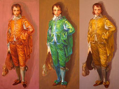 To make an impact at the opening of the Royal Academy in 1770, Thomas Gainsborough dressed the son of a friend in a Cavalier costume from the previous century. He "appropriated" the pose from a portrait by his idol, Antony Van Dyck. When I was young, "Blue Boy" seemed to be on every calendar. Eager to try a series of variations on one masterpiece, I decided it was time for a young man who has been going around in satin and lace for more than 200 years to lighten up about color.