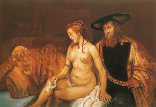 Philosophy has always seemed to me a lonely job, so I offered Aristotle a little company. Contemplating the bust of the poet Homer, he perhaps gave some thought to the brevity of life and its pleasures. For a companion, I chose someone in need of wisdom, the biblical Bathsheba, contemplating a seductive offer in a letter from King David. We can assume the philosopher advised her that the path to well-being lay in the contemplative life, not in the pursuit of pleasure. On the other hand, she might have reflected on Homer's observation, "It is not possible to fight beyond your strength, even if you strive."