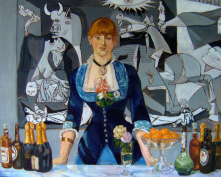I wanted to keep the message of Picasso's Guernica for today in a painting more in my style. If there is humor here, it's very bitter. I use Guernica to represent the threat of war close to home that hangs over the country, increased rather than lessened by government policies. As the rest of us are encouraged to consume and party on, brave young men and women and their families are sacrificed in a callously cruel, false-from-the-beginning cause.