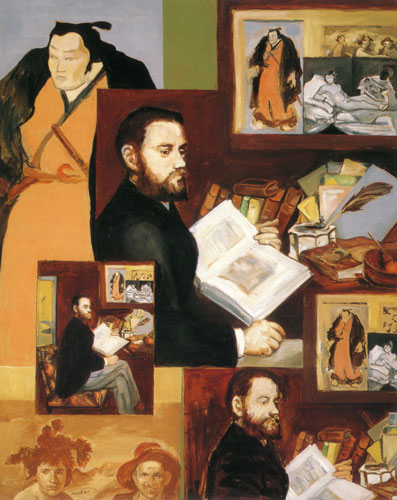 pays tribute to his new artistic sources. Zola holds in his lap an illustrated